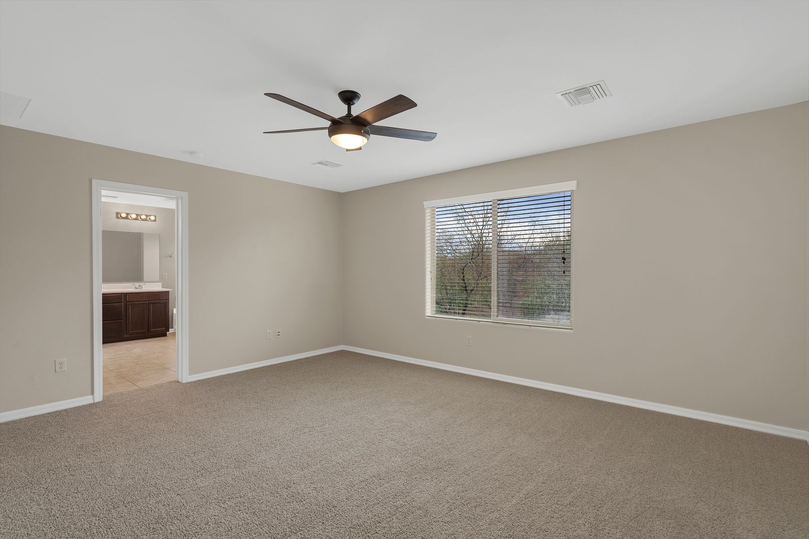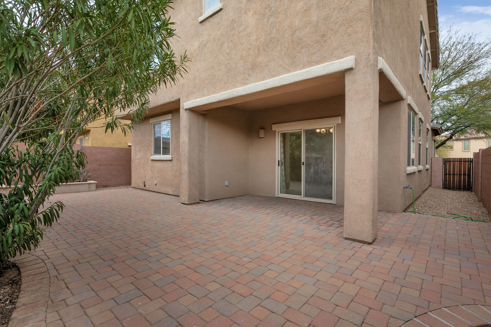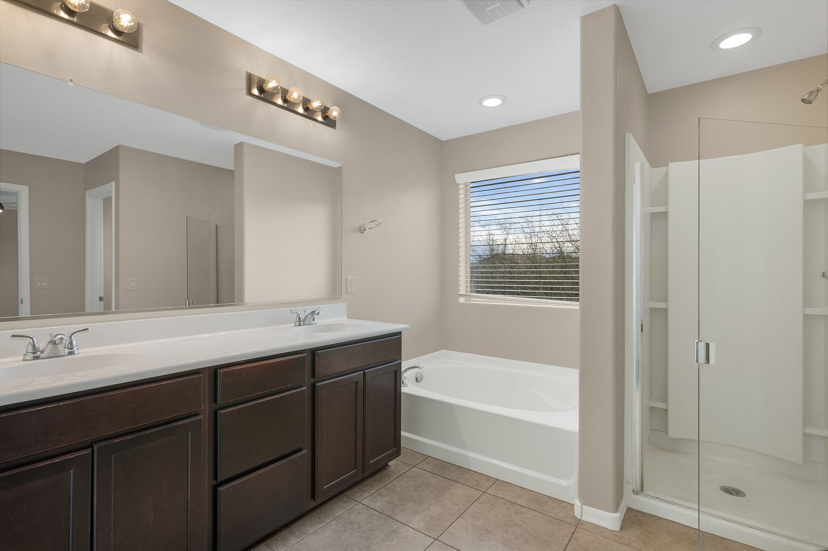 The grand primary suite offers a walk-in closet, dual vanity, garden tub, and separate shower. Additional highlights include upgraded lighting, ceiling fans throughout, a brick-paver backyard, and a 2-car garage. Enjoy all the incredible amenities Rancho Sahuarita has to offer — including a community pool, fitness center, basketball courts, putting green, and so much more.